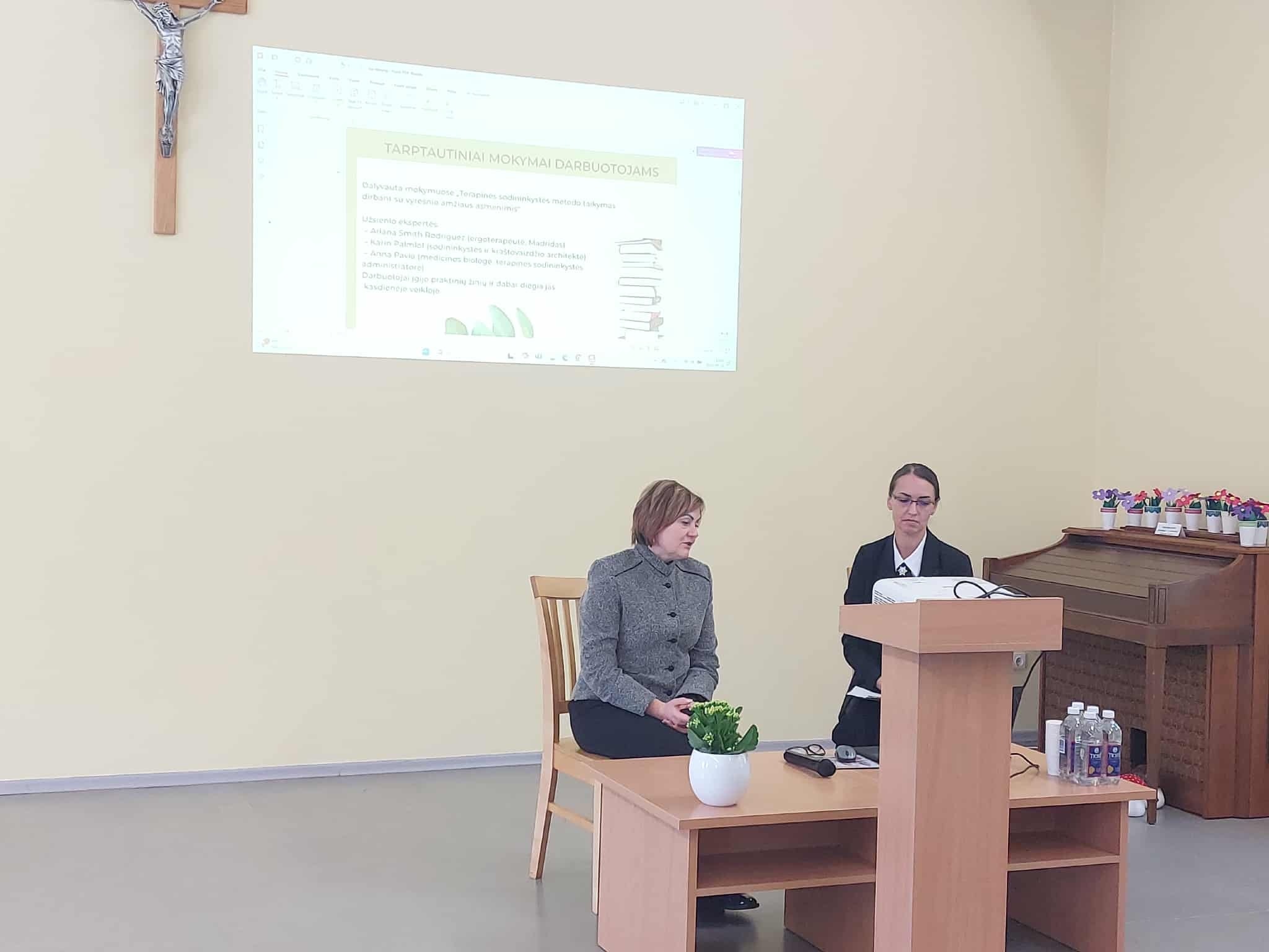 Prienų globos namų Socialinio darbo skyriaus vadovė Angelė Gavelienė ir socialinė darbuotoja Birutė Bajorienė skaitė pranešimą „Terapinių sodų metodo taikymas Prienų globos namuose“, kuriame dalijosi įžvalgomis apie terapinių sodų naudą globos namų gyventojams ir darbuotojams.